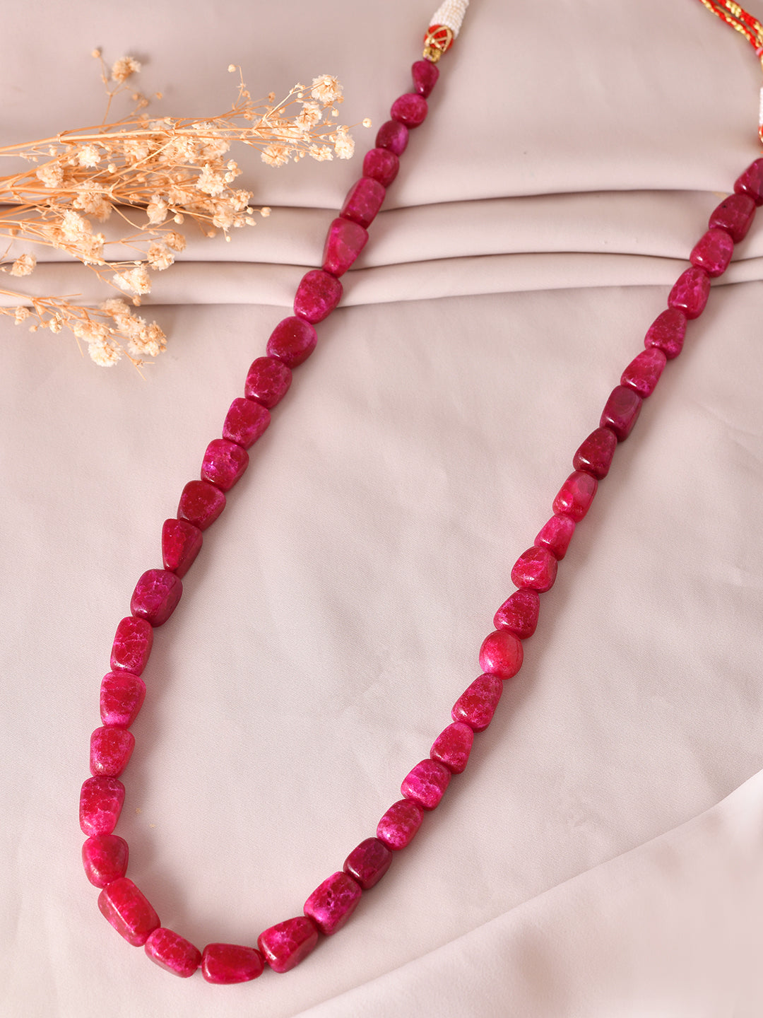 The pink stone beaded necklace, designed in a classic mala style with smooth irregular beads for a handcrafted appeal. Finished with a beautifully detailed adjustable dori tie featuring pearl and red bead tassels, this necklace adds a touch of traditional to any outfit.
