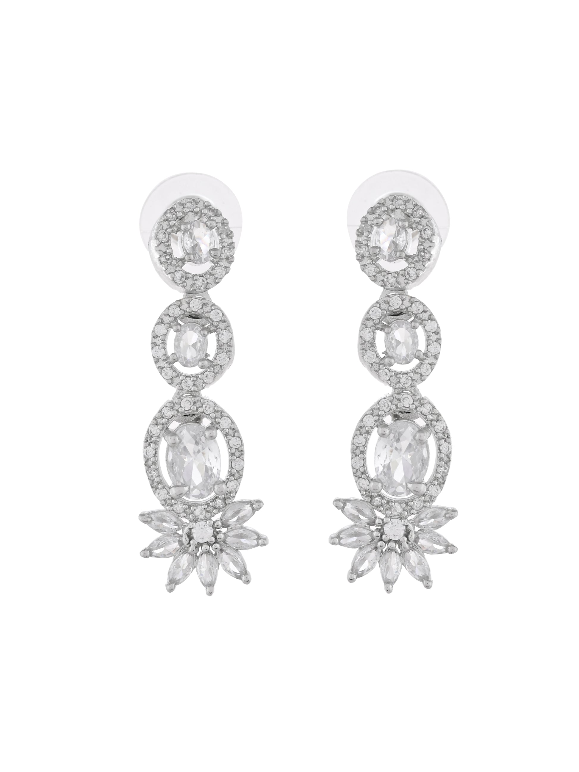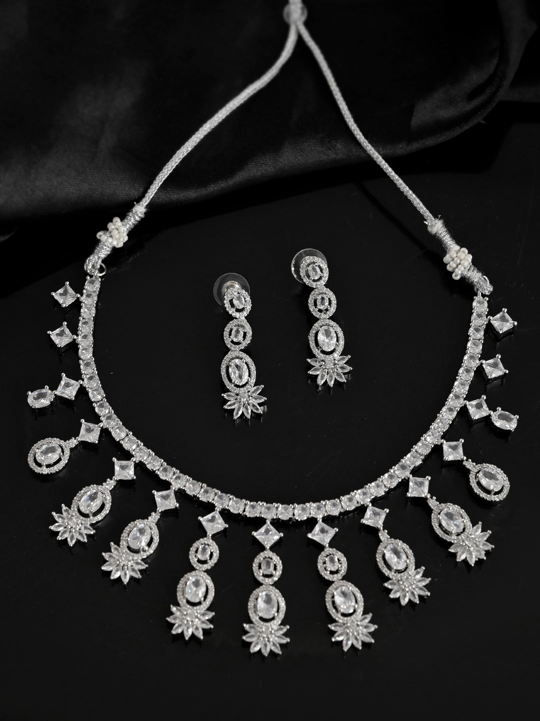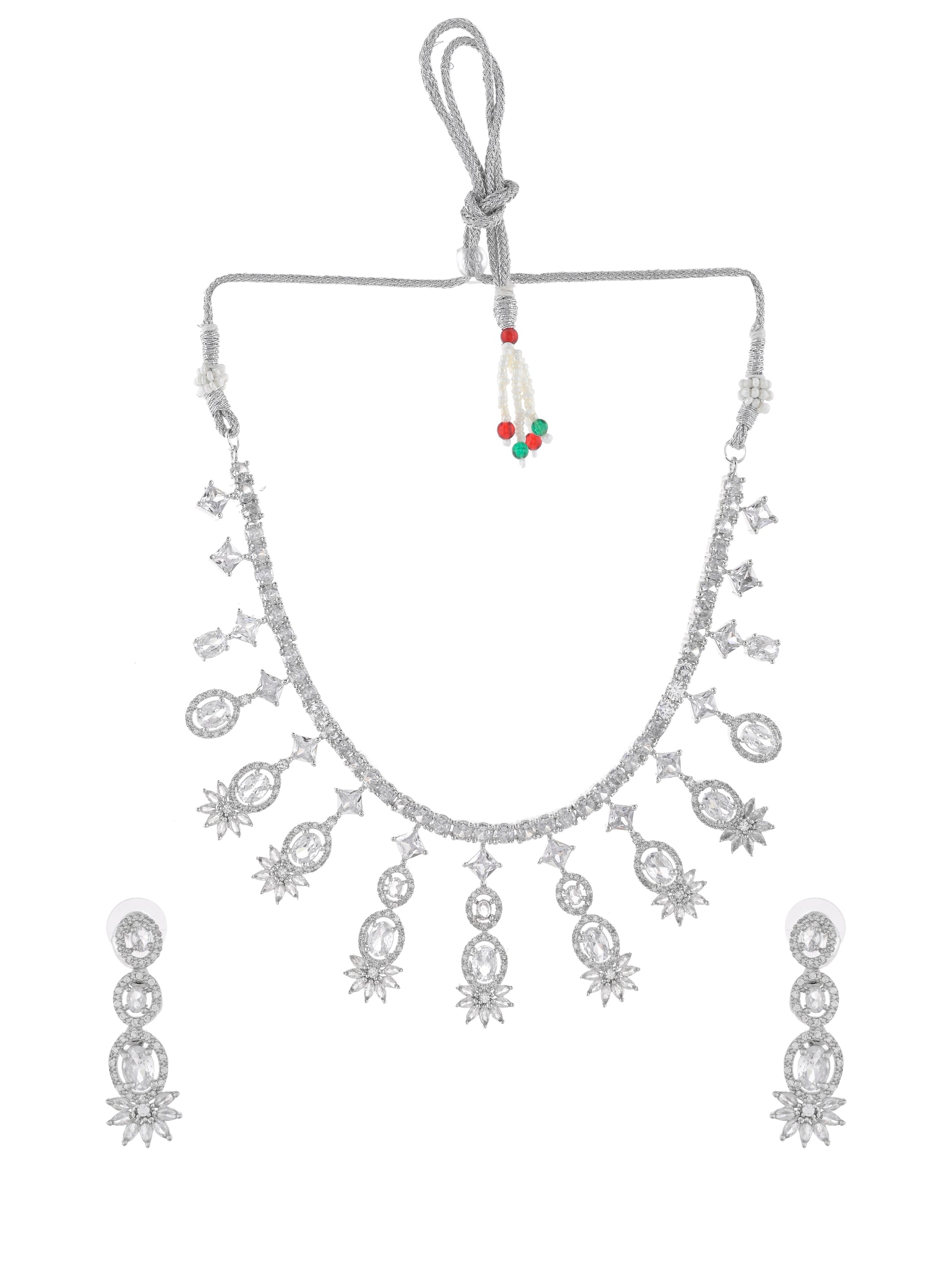 The necklace showcases a captivating pendant design that rests beautifully on the neckline, making it perfect for weddings, anniversaries, or formal events. Complementing the necklace, the matching earrings offer a delicate yet striking sparkle that adds a refined touch to any outfit.