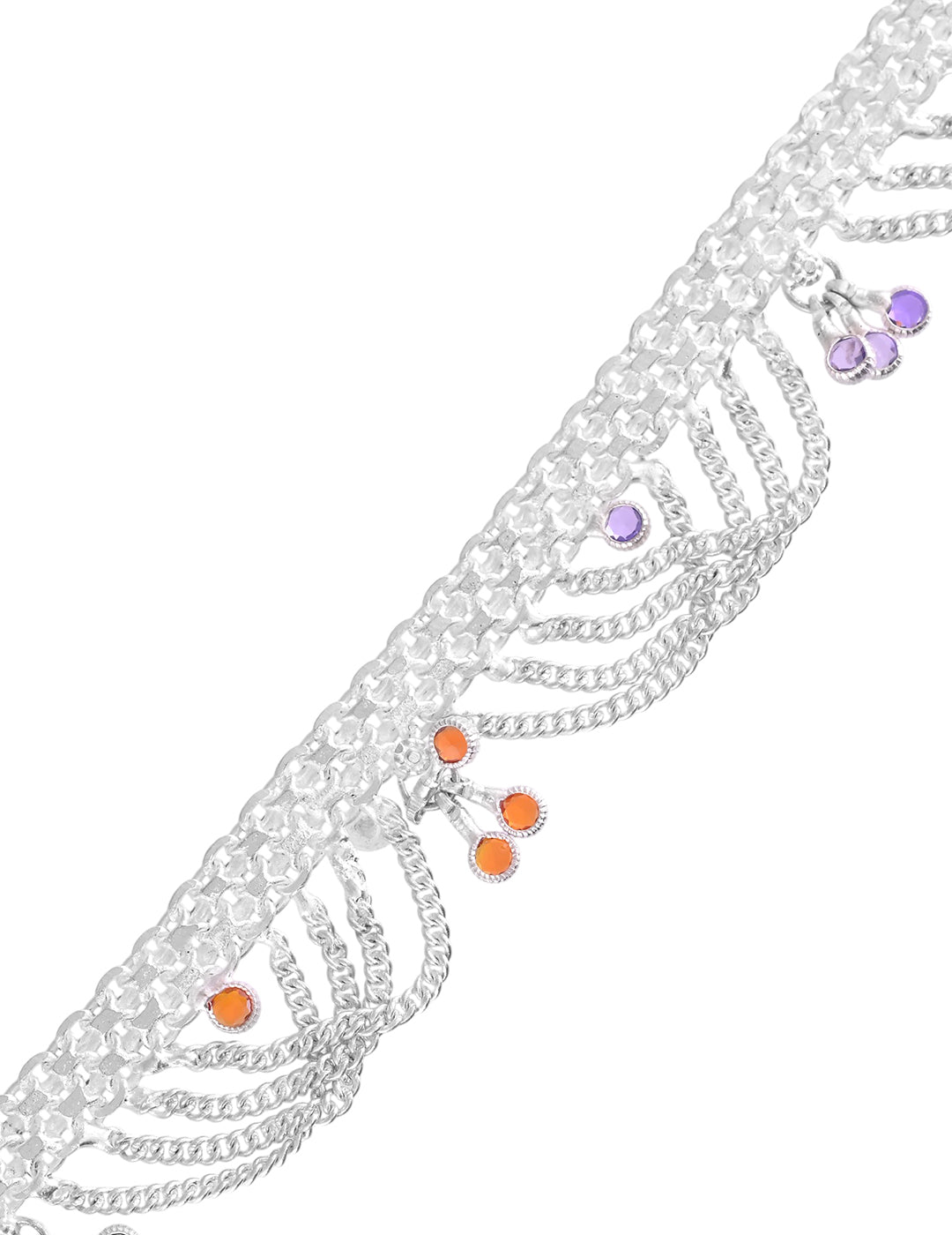 Crafted from premium brass material and coated with high-quality silver plating, the anklets offer a radiant finish that stays lustrous over time. The vibrant multicolor stones bring a cheerful touch to your attire, while the lightweight design ensures all-day comfort. Pair them with sarees, lehengas, or western outfits for a graceful foot accessory that never goes out of style.
