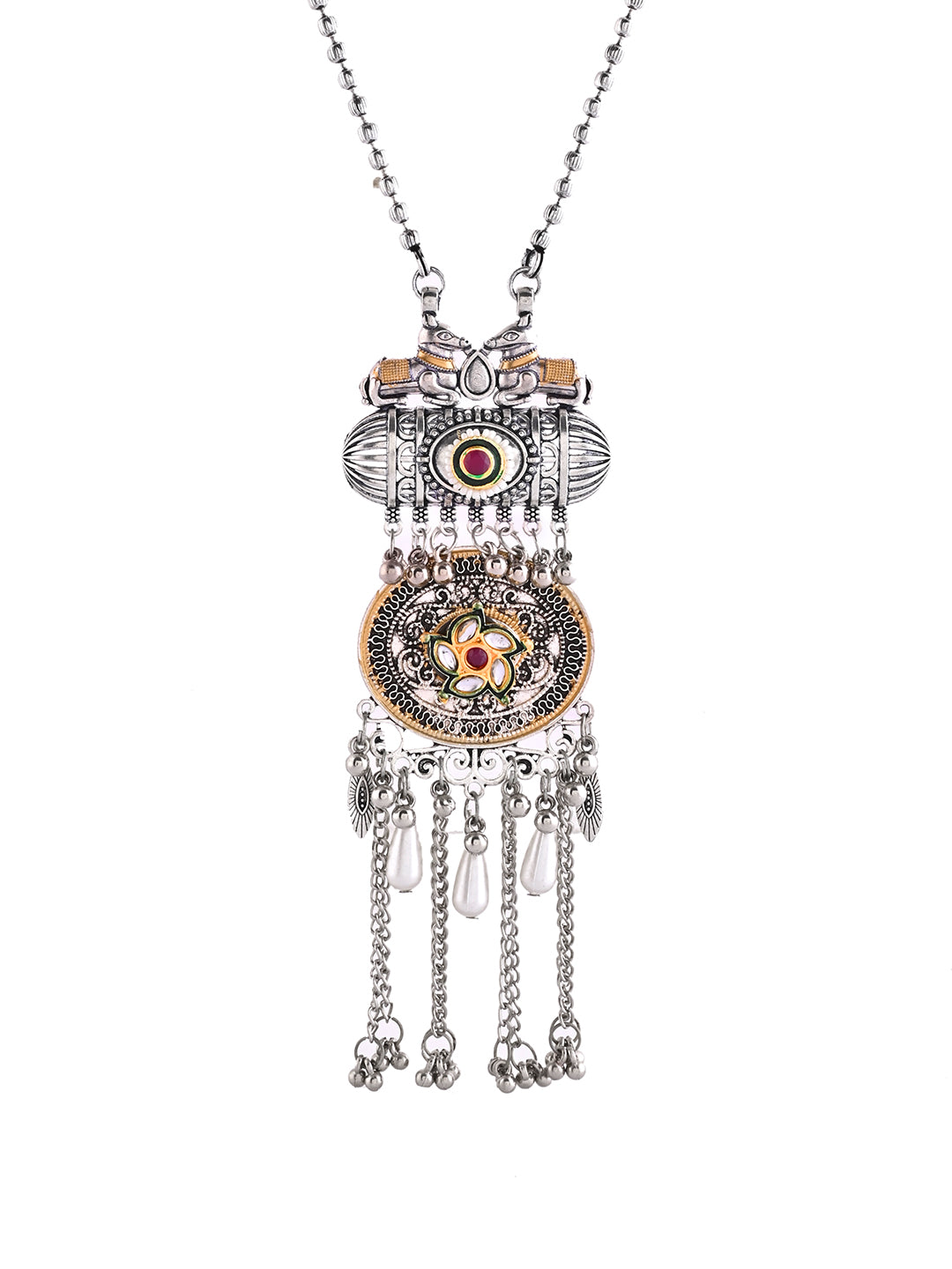 Add a touch of elegance to your ethnic look with this Silver Oxidised Tribal Necklace Set, featuring a beautifully carved Afghani-style pendant adorned with coloured stones and hanging pearl charms. Paired with matching drop earrings, this lightweight jewellery set is perfect for festive wear, traditional functions, weddings, parties, Garba, and daily styling.