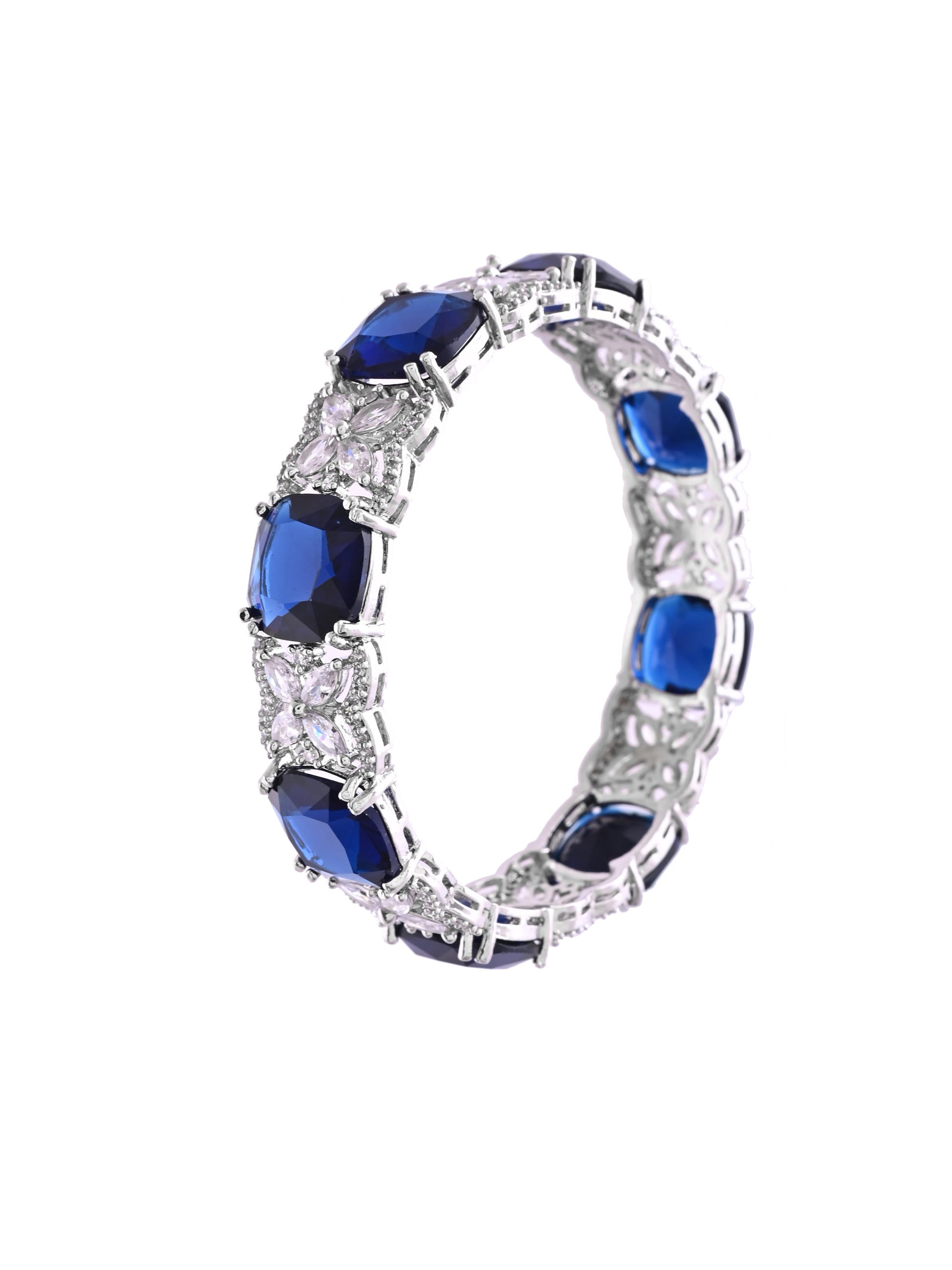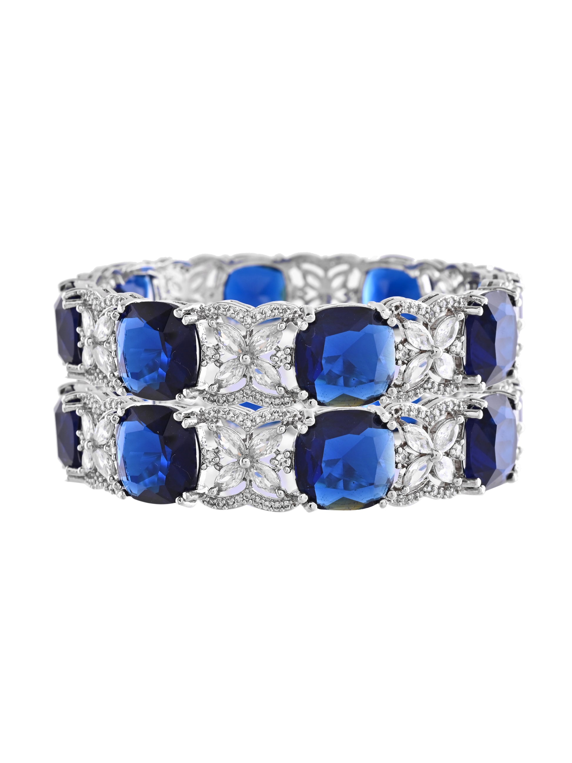 Make a sophisticated statement with these stunning silver-plated bangles embellished with brilliant blue cushion-cut CZ stones and sparkling crystal accents. Designed with a premium shine and intricate detailing, these bangles add a luxurious touch to any festive or party outfit. The vibrant red stones paired with elegant silver plating create a rich and glamorous look, making them perfect for weddings, engagements, receptions, festivals, and special occasions. Lightweight, comfortable, and beautifully crafted, these bangles elevate your entire ensemble effortlessly.