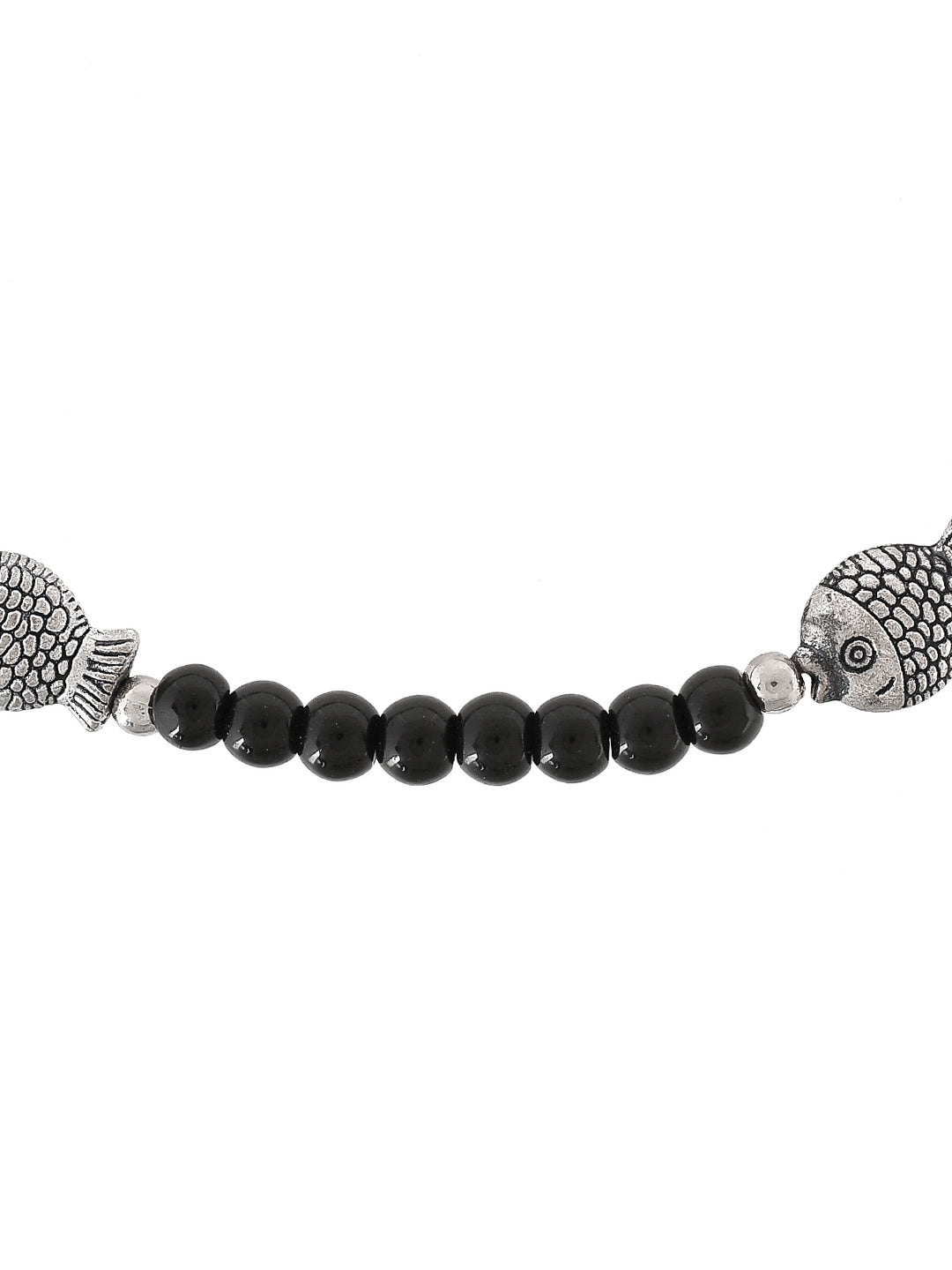 Silver Plated Oxidized Black Beads Anklet With Fish Charm