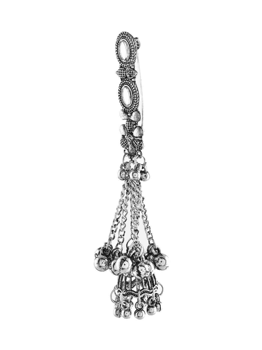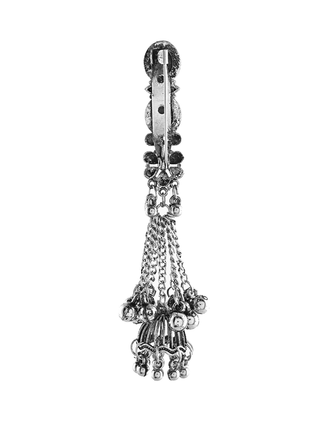 Enhance your saree drape with this elegant Oxidised Silver Saree Pin, designed with intricate carving and hanging ghungroo chains. This handcrafted saree latkan adds a stylish and secure touch to your pallu, giving your traditional outfit a refined and fashionable look. Lightweight, durable, and easy to pin, it is perfect for everyday ethnic wear as well as festive occasions.