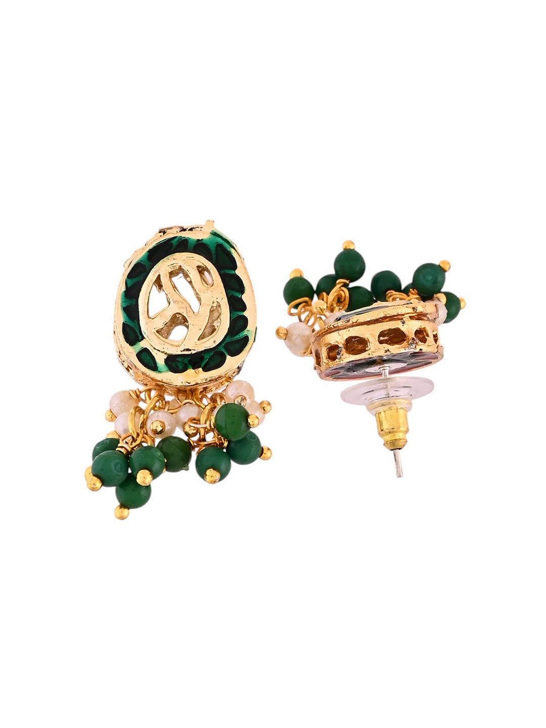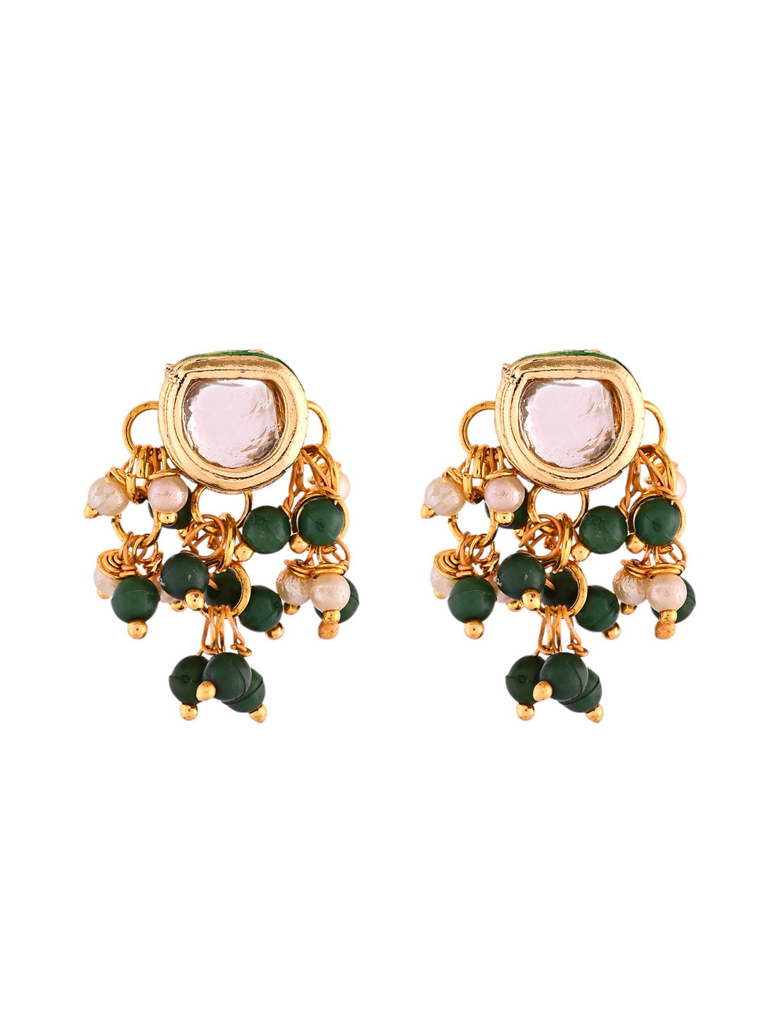 The necklace is adorned with hanging green beads and tiny pearl clusters that add movement and richness. This vibrant, gold-plated choker is perfect for weddings, parties, festivals, and traditional outfits.