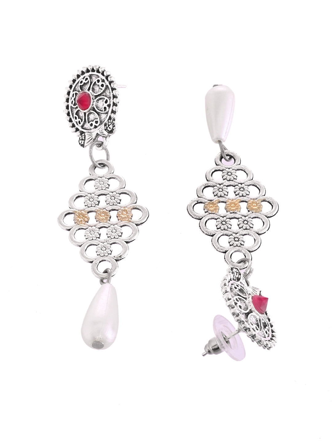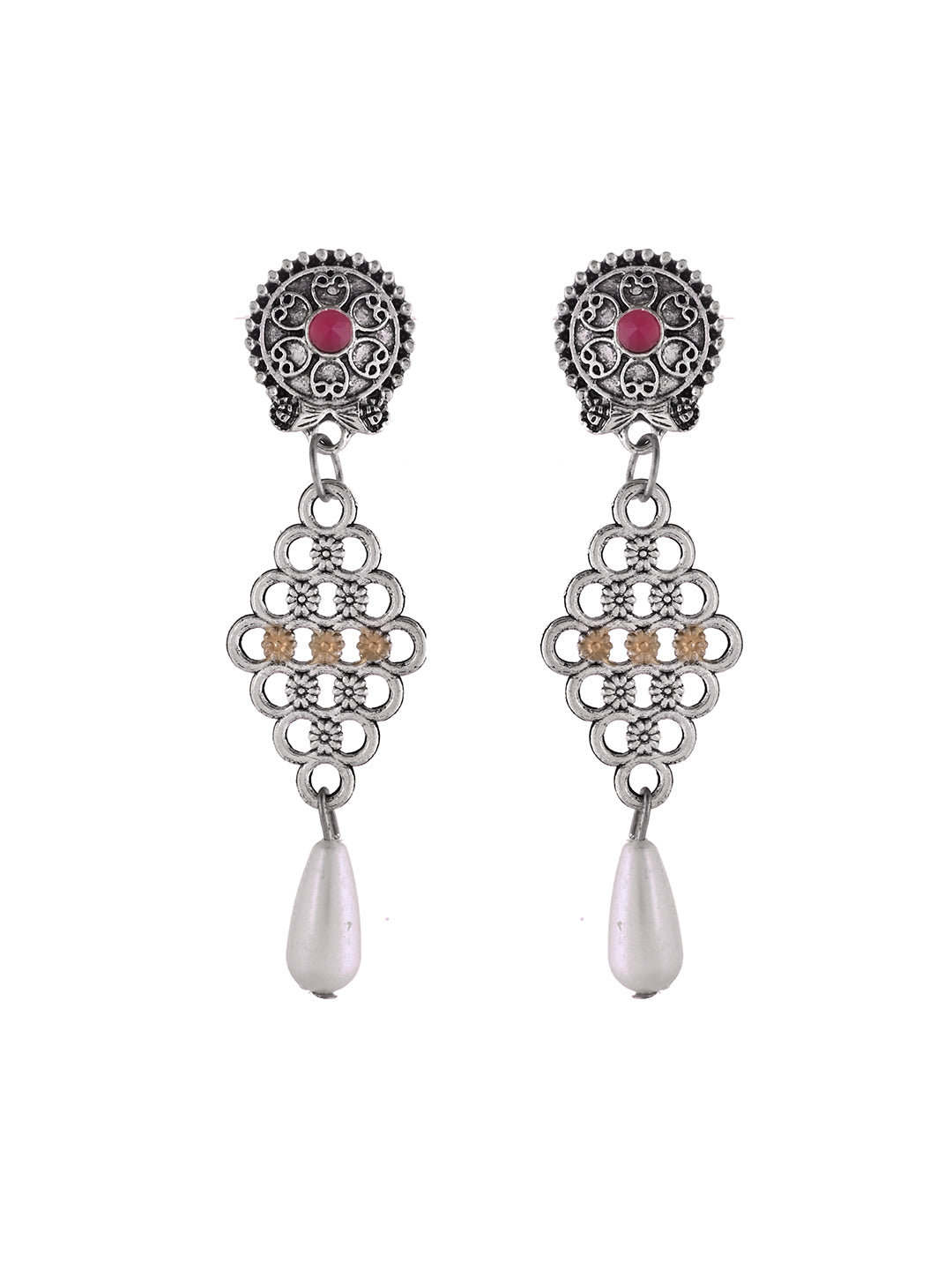 Add a touch of elegance to your ethnic look with this Silver Oxidised Tribal Necklace Set, featuring a beautifully carved Afghani-style pendant adorned with coloured stones and hanging pearl charms. Paired with matching drop earrings, this lightweight jewellery set is perfect for festive wear, traditional functions, weddings, parties, Garba, and daily styling.