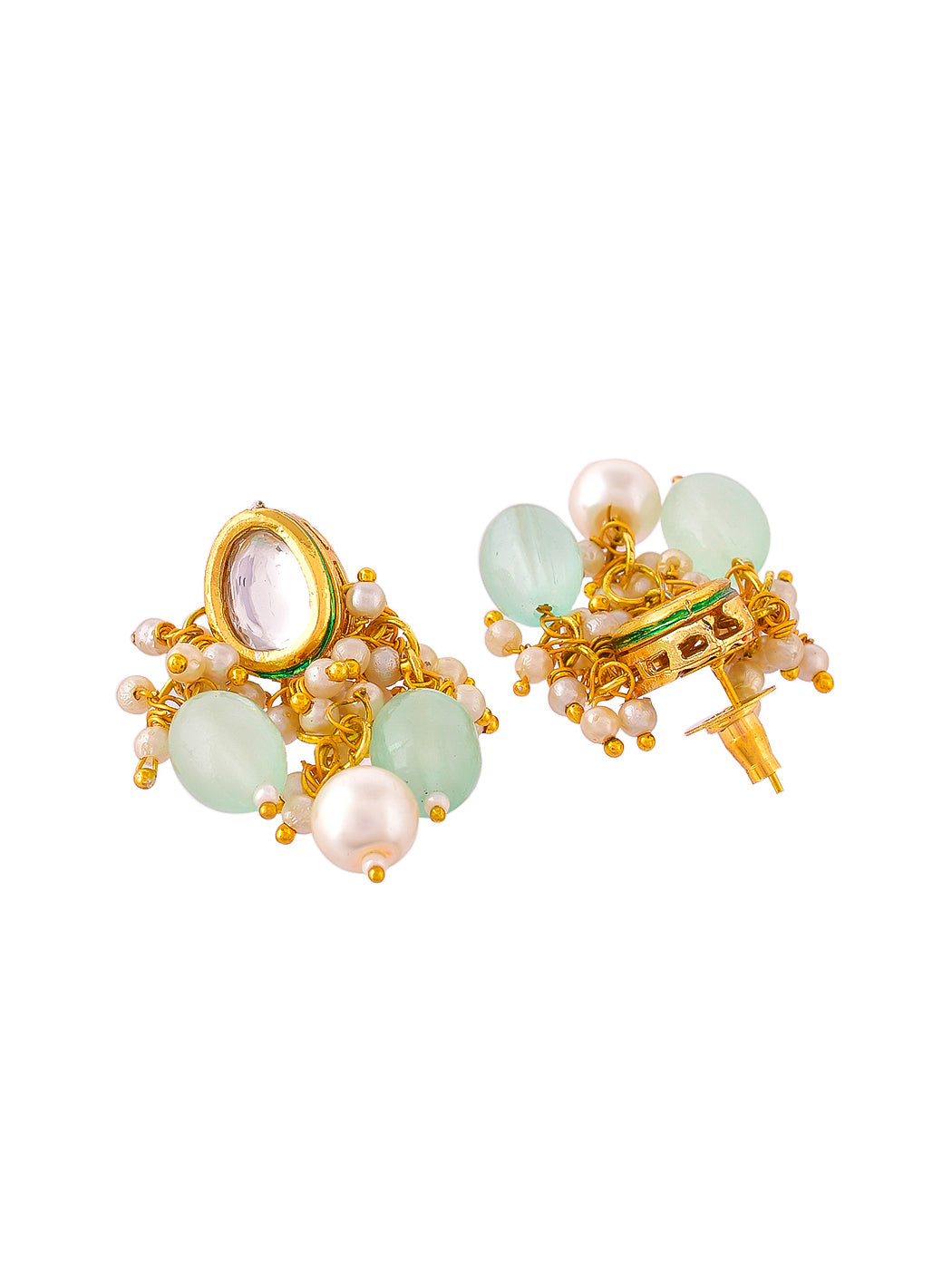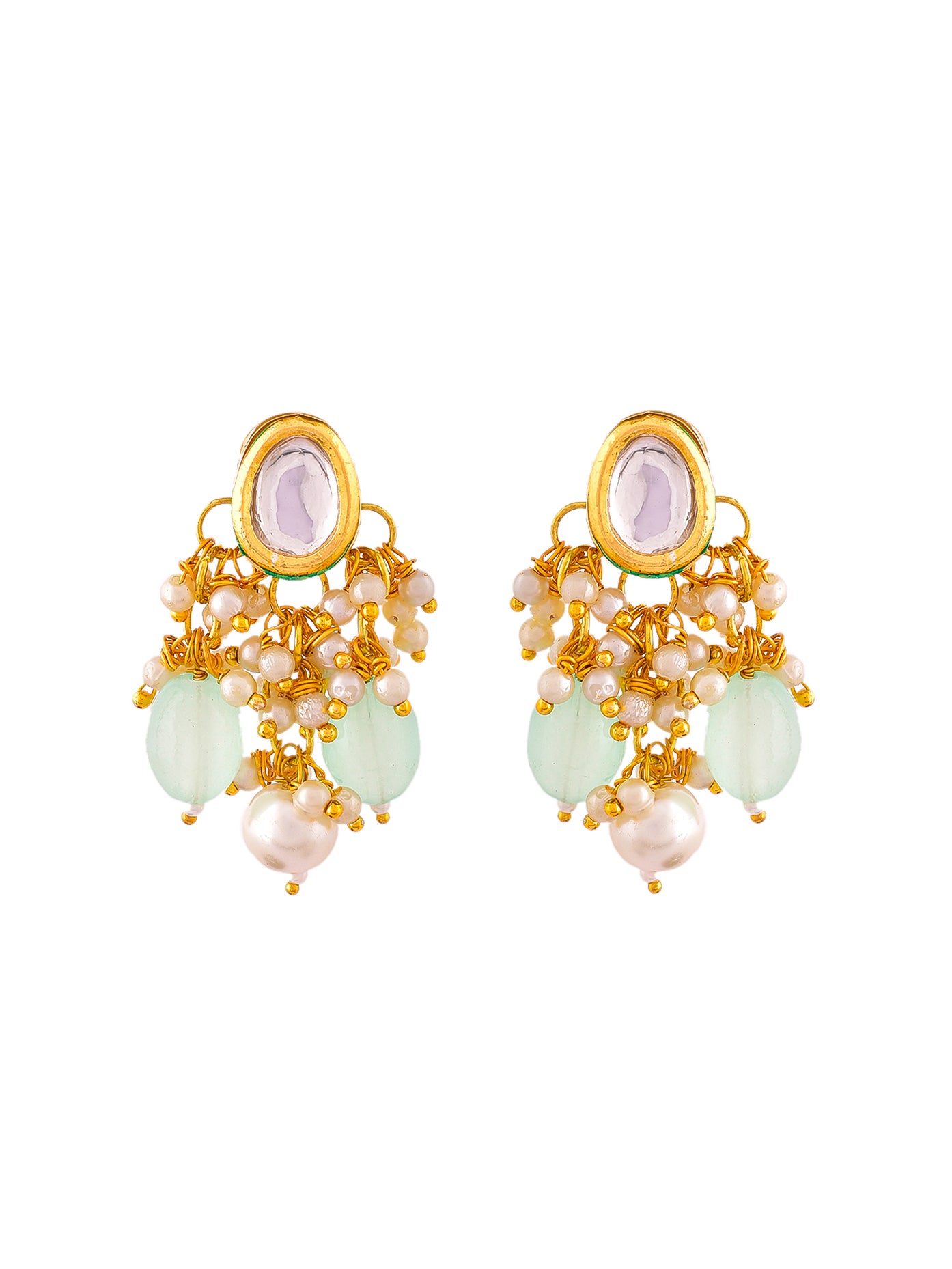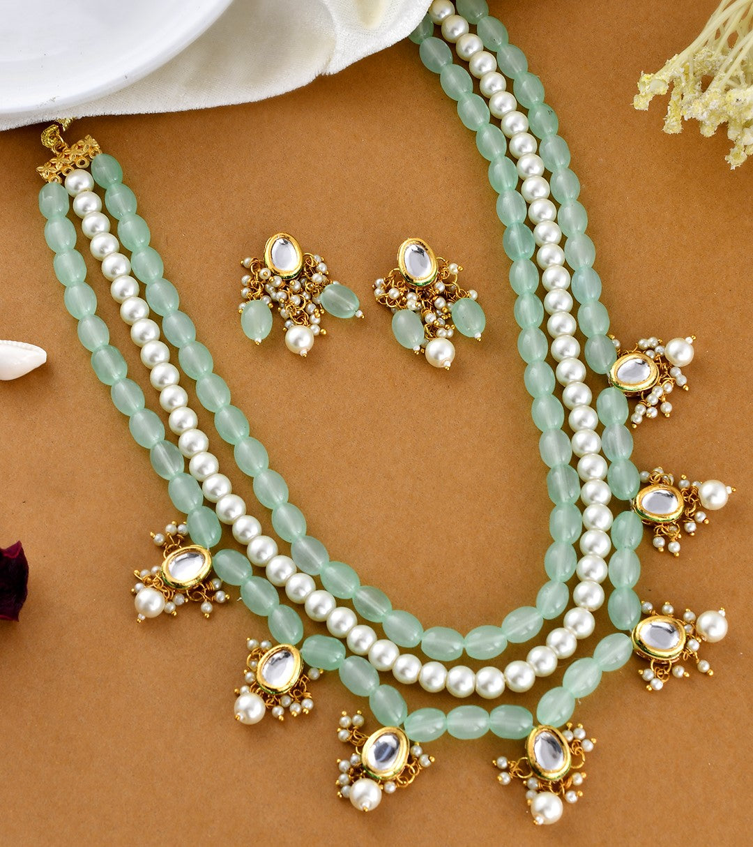 Traditional Pearl Layered Long Jewellery Set a harmonious blend of tradition and modernity. Featuring a dual strand of serene aqua beads and lustrous pearls, each piece is meticulously handcrafted to perfection. The golden embellishments, adorned with intricate designs and embedded with precious stones, add a touch of royal elegance. This necklace is not just jewelry but a piece that narrates a story of craftsmanship and luxury. Ideal for festive occasions and celebrations, it promises to be a conversation starter, making you the center of attention wherever you go.