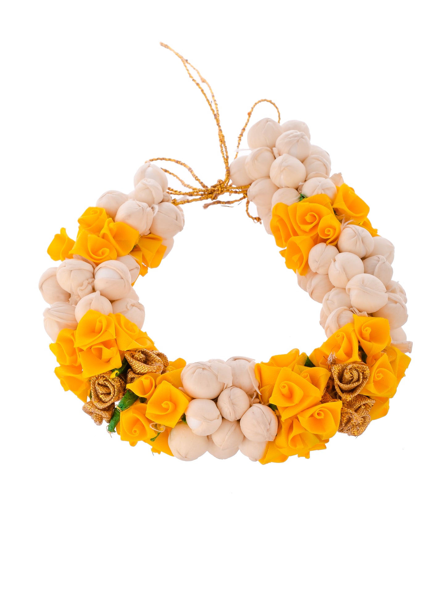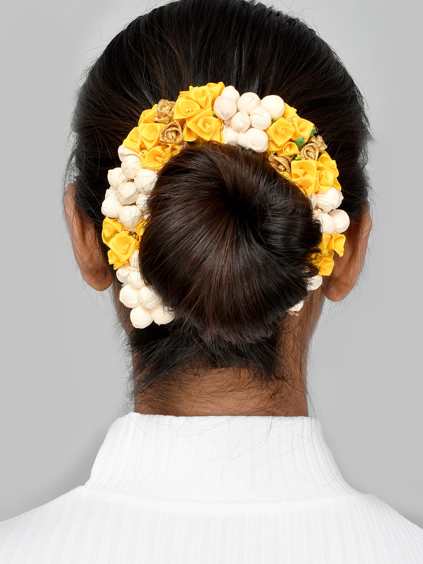 The yellow floral beni juda hair accessory set. The beni can be tied with zari gotta dori according to bun size. The white mogra and yellow flower with tint of golden flower in between makes it a perfect hair accessories for function, parties, wedding or dance events like bharatnatyam, kathak.